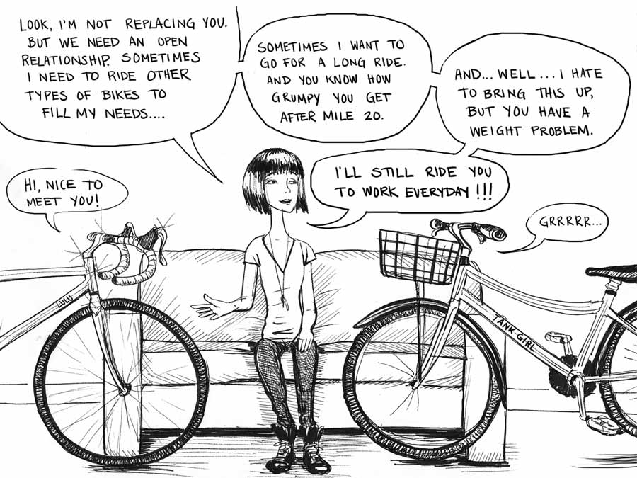 can I just say that I think I am developing a crush on your blog…you have captured perfectly the joy and love of having a new bicycle, and also the heart wrenching emotions you face when explaining to your old bike that you are now poly with other bikes…in short you are my hero, and I look forward to your next awesome comic šŸ™‚