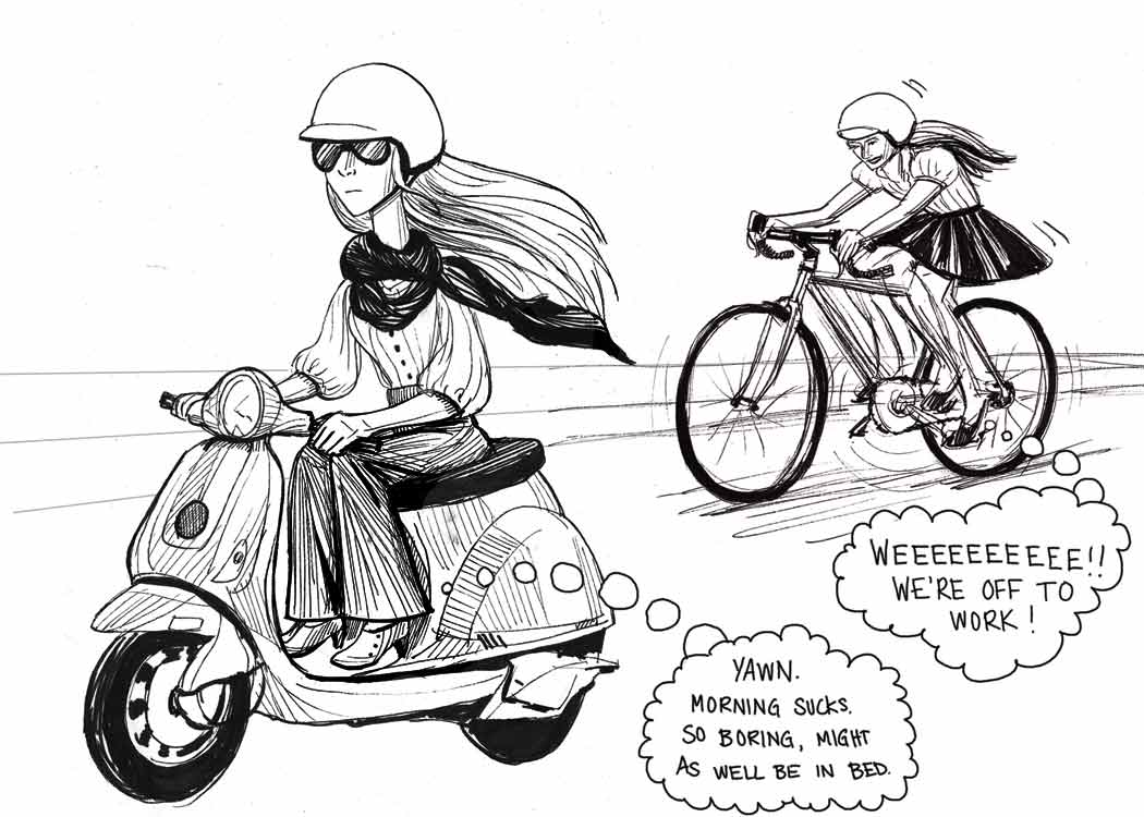 As a Vespa owner and someone just getting into cycling, I can tell you that riding a Vespa isn’t boring at all. 🙂 It’s fun and exhilarating and takes up a lot less space on the road, and is better for the environment than driving a car. It also can be surprisingly utilitarian. When I lived in a warmer climate and my car at the time was an unreliable pile of crap, I rode the Vespa daily, even doing my shopping on it. I moved back to the midwest and my Vespa has suffered for it, I don’t feel where I live now is as motorcycle friendly (it technically is a motorcycle, and can get up to 70-80 mph depending on the model). In fact within the first few months of riding up here, some moron rear ended me. I’m starting to bike more because I also enjoy that, but I don’t think either the bike or the Vespa could ever replace each other.